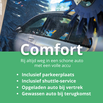 Een parkeerplaats bij ParkFlyCharge is altijd inclusief laadgarantie. Dat betekent dat je altijd met een volle accu vertrekt! Boek meer extra's voor nog meer comfort en voordeel!